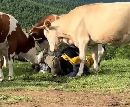 近日,有视频显示,多位游客在山西忻州五台山风景区朝台徒步时,挑逗山上的牛后被牛群攻击踩踏。