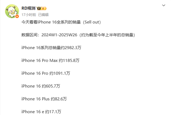 【CNMO科技消息】近日,有数码博主曝光了iPhone 16系列截止2025年第26周在中国大陆市场的最新销量数据: