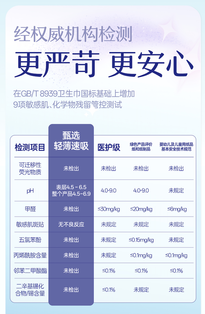为确保女性安心使用,东方甄选还额外增加了9项敏感肌及化学物残留检测项目,甲醛、可迁移性荧光物质均为“未检出”。同时,东方甄选承诺,绝不使用回收料,绒毛浆采购链条均可溯源,进一步保障健康安全。