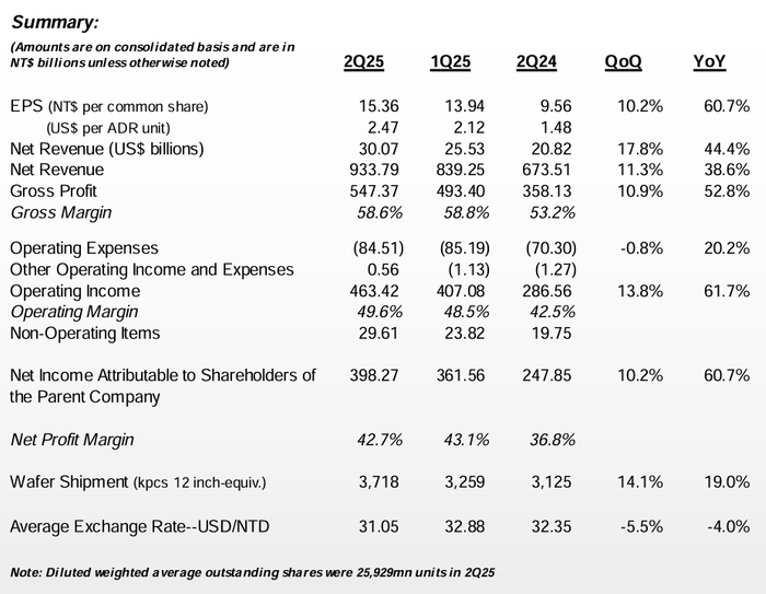 台积电二季度营收表现超出市场预期,同比增长38.6%达到新台币9337.9亿元,环比增长11.3%。以美元计价的营收增幅更为显著,同比增长44.4%至300.7亿美元,环比增长17.8%。增长主要由3nm制程的持续爬坡和HPC需求的爆发性增长驱动。