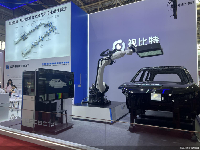 在本届链博会智能汽车链展区,一只在车身构架旁举着“大相机”的机械手臂吸引众多参观者驻足,这是湖南视比特机器人有限公司(以下简称“视比特”)展台上的“PaintPro”漆面缺陷检测以及磨抛修复系统。