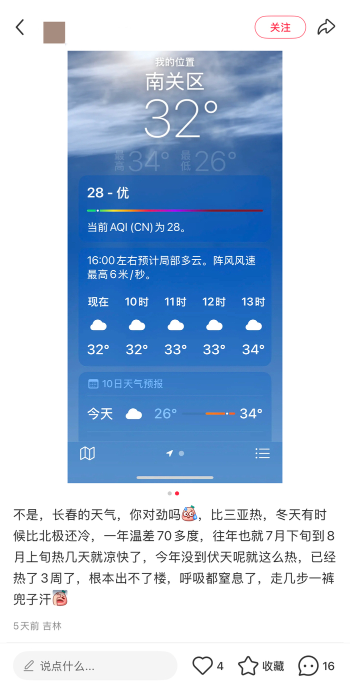 作为“最爱三亚”的东北人也将东北的气温和三亚对比:“长春的天气,你对劲吗,比三亚热……呼吸都窒息了,走几步一兜子汗。”