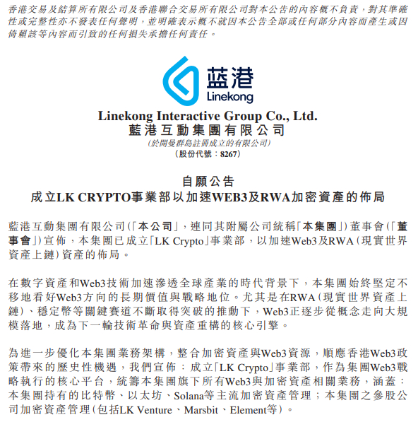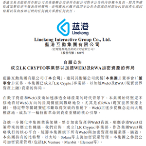 受此消息刺激,港股市场相关股票开始沸腾。蓝港互动一度暴涨超45%,新火科技控股一度大涨近8%。蓝港互动宣布成立LK Crypto事业部,整合集团加密资产与Web3资源,核心布局包括主流加密资产管理和RWA赛道。(文馨)