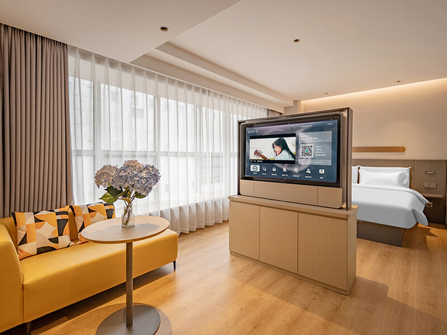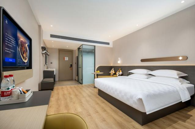 酒店紧邻金信广场,周边商圈成熟,购物、餐饮便利。酒店配有多种房型,房间布局注重功能性,装修风格简洁现代。客房内配备智能语音系统,兼顾科技感与舒适性。