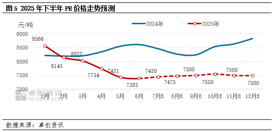 供需矛盾突出是PE多数品种价格重心处于下跌通道的重要因素。2025年上半年,内蒙古宝丰、埃克森美孚(惠州)、裕龙石化等装置相继投产,同时叠加24年四季度投产的中石化英力士石化等装置,新增产能持续释放,国产供应压力增加,但下游领域多表现平平,工厂普遍备货意愿度不高。同时突发事件方面,因中美关税贸易战,塑料制品出口在上半年出货受阻,工厂订单量下滑,PE市场供需矛盾成为常规化表现。