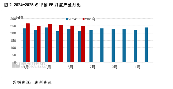 产能的持续释放叠加检修小年因素影响,据卓创资讯统计,2025年上半年PE国产量合计达到1535.17万吨,同比2024年上半年增幅在14.06%。从分品种来看,LLDPE及LDPE品种上半年开工负荷均值分别在106.04%和79.68%,均较去年同期有所提升,分别提升10.09及3.78个百分点,而HDPE品种上半年开工负荷下滑7.05个百分点至61.04%,所以也是HDPE品种在上半年表现出来较强抗跌性的原因之一。