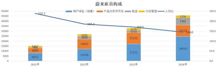 根据市场测算,一线城市蔚来NIO House单店年运营成本超2000万元,相当于传统4S店的3倍;客户服务团队超8000人,对应地,蔚来四年间员工总数从1.5 万扩充到4.5万名(小鹏1.5万名员工、理想3.2万名员工),蔚来雇员开支24年分别占研发费用与营销、一般及行政费用的67.8%与47%。