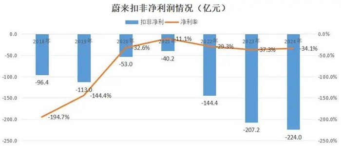 为方便统计,我们将比照数据从开头的归母净利调整为扣非净利,则2018年-2024年蔚来合计亏损金额为878亿元。