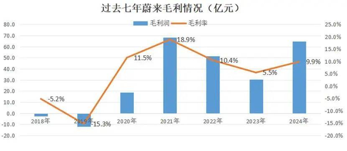 定价战略摇摆、换电重资产运营模式合力下,蔚来的毛利率水平不断下探,七年间蔚来最高毛利率为2021年的18.9%,到2024年毛利率下探至9.9%,垫底“蔚小理”(小鹏14.3%、理想20.5%)。