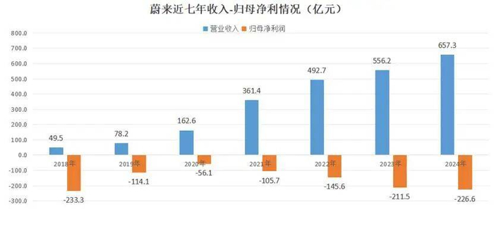 财报数据显示,近七年来蔚来营业收入共计实现营业收入2357.9亿元,对应合计亏损超千亿——蔚来七年间累计归母净亏损达1092.9亿元。