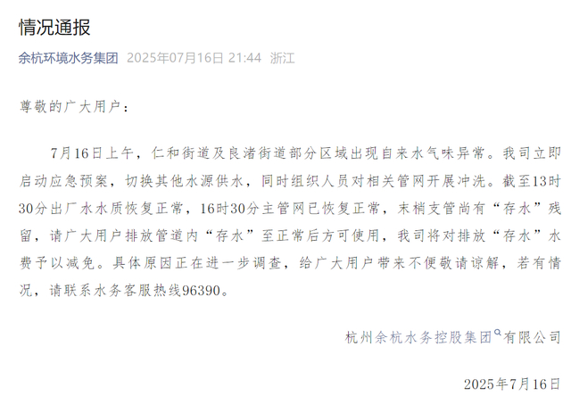 记者注意到,7月16日21时44分,余杭环境水务公众号发布了情况通报。通报中提到:“ 7月16日上午,仁和街道及良渚街道部分区域出现自来水气味异常。我司立即启动应急预案,切换其他水源供水,同时组织人员对相关管网开展冲洗。截至13时30分出厂水水质恢复正常,16时30分主管网已恢复正常,末梢支管尚有‘存水’残留,请广大用户排放管道内‘存水’至正常后方可使用,我司将对排放‘存水’水费予以减免。具体原因正在进一步调查。”