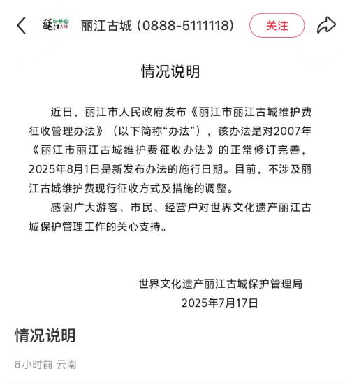 记者还注意到,7月17日上午,丽江古城管理局曾通过小红书认证账号“丽江古城”发布一份《情况说明》,称近日发布的《丽江市丽江古城维护费征收管理办法》是对2007年《丽江市丽江古城维护费征收办法》的正常修订完善。目前,不涉及丽江古城维护费现行征收方式及措施的调整。