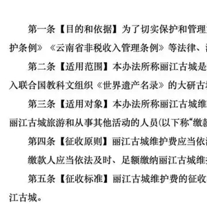 记者在丽江市政府官网看到了《丽江市丽江古城维护费征收管理办法》。古城维护费适用于列入联合国教科文组织《世界遗产名录》的大研古城(含黑龙潭)、白沙民居建筑群、束河民居建筑群三片区域。收费标准为每人单次缴费50元,有效期365天,有效期内,缴款人可不限次数进入丽江古城。该办法将于2025年8月1日开始实施,同时废止2007年7月1日起施行的旧版征收办法,
