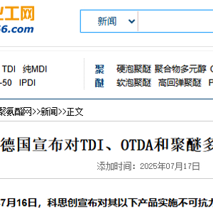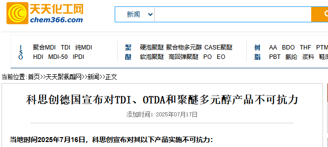天天化工网站最新消息,当地时间2025年7月16日,科思创宣布对其以下产品实施不可抗力: