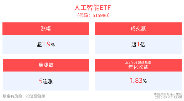 截至7月16日,人工智能ETF近1年净值上涨40.06%,指数股票型基金排名514/2915,居于前17.63%。从收益能力看,截至2025年7月16日,人工智能ETF自成立以来,最高单月回报为30.38%,最长连涨月数为3个月,最长连涨涨幅为43.97%,上涨月份平均收益率为6.80%。