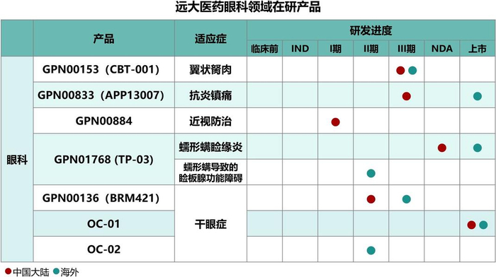 其中,用于治疗蠕形螨睑缘炎的全球创新眼科药物GPN01768 (TP-03,洛替拉纳滴眼液,0.25%)已于2024年12月向药监局递交了新药上市申请并获得了受理,于2025年5月获得中国澳门特别行政区政府药物监督管理局批准上市;用于抗炎镇痛的激素纳米混悬滴眼液GPN00833于2024年11月完成国内III期临床研究并达到了临床终点;用于治疗翼状胬肉的创新改良型新药GPN00153 (CBT-001)于2024年3月完成中国III期临床研究首例患者入组,于2025年6月完成国际多中心III期临床研究全球中心全部患者入组;用于推迟儿童近视进展的全球创新眼科药物GPN00884于2024年6月完成中国I期临床研究首例患者入组给药。[3]