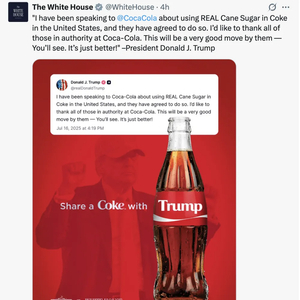 白宫社交媒体账号转发特朗普关于让在美销售可口可乐使用蔗糖帖文的截图。