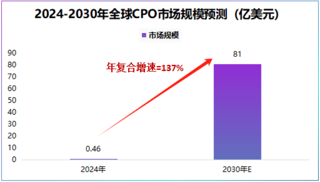据预测,CPO市场规模将从2024年不到0.5亿美元增长至2030年的81亿美元,年复合增长率约达137%。
