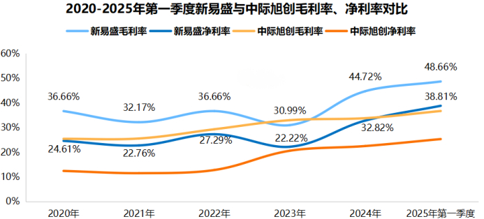 这一点从成本利润率上也能看到,新易盛成本费用率从2023年的30.01%提高到了2025年第一季度的69.39%,超出中际旭创30多个百分点,这意味着新易盛单位成本带来的利润效用更大。