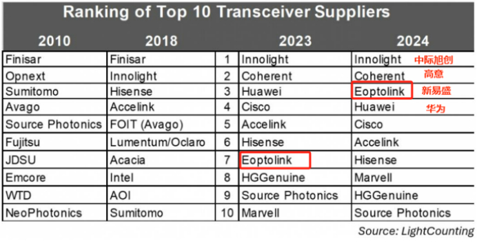 得益于长期深耕高速率产品,新易盛全球市占率从2023年的第七跃升到了2024年的第三,超越了华为。