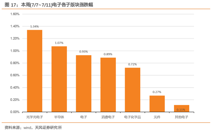 电子板块细分行业部分上涨。光学光电子/半导体/电子/消费电子/电子化学品 /元件/其他电子本周涨跌幅分别为1.34%/1.07%/0.93% /0.89%/0.72% /0.27%/0.11%。