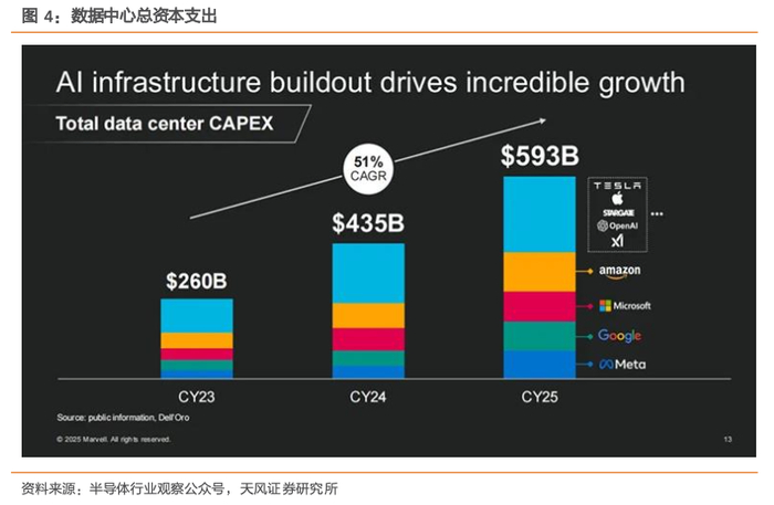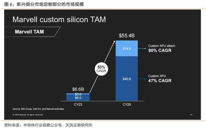Marvell更新ASIC市场预判,Marvell预测2028 年涵盖ASIC市场将达到940亿。云计算四巨头资本支出2023年1500亿美元、2024年超2000亿美元、2025 年预计超3000亿美元,其中最大一部分资金将投向“定制芯片”;新兴超大规模云服务商(如 xAI、特斯拉)及各国政府也在布局,以xAI为代表的公司已经认识到控制自身基础设施的价值,正在建设专属数据中心。XAI在短短一年内就建成了一个20万单元的AI集群,并成功开发出强大的Grok模型;构建终端应用的公司也在为AI构建高度专业化的基础设施。特斯拉建造了基于Dojo的数据中心,为完全自动驾驶背后的AI提供算力支持;还有所谓"主权AI"的兴起,世界各国政府也在发起重大投资,建设本地AI基础设施。美满电子去年提及的 AI 相关市场(涵盖定制ASIC、交换、互连和存储)规模为 750 亿美元,复合年增长率近 30%;如今该市场总体增长约 25%,预计 2028 年达 940 亿美元,复合年增长率提升至 35%。其中,计算市场较去年预测扩大近 30%,互连市场增长约 37%。