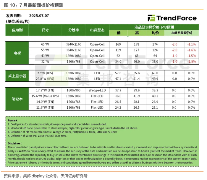 部分品牌笔电面板需求转乐观、动能稍增,价格预估持平,后续取决于商谈情况:第三季度部分品牌客户对笔电面板需求展望转趋乐观,需求动能稍增强,但与面板厂的议价态度转趋积极,希望通过增量取得更多价格优惠;各面板厂现阶段试图通过台面下的价格优惠稳定客户需求,维持市占率及台面上价格稳定;7 月笔电面板价格预估整体维持持平态势,后续走势仍取决于品牌客户与面板厂的商谈情况。