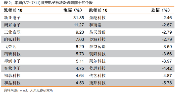 本周(7/7~7/11)消费电子板块涨幅前10的个股为:新亚电子、奕东电子、工业富联、昀冢科技、飞荣达、精研科技、得润电子、春秋电子、福蓉科技、和晶科技。跌幅前10的个股为:盈趣科技、和而泰、易天股份、奥海科技、领益智造、朝阳科技、莱尔科技、蓝思科技、传艺科技、捷邦科技。