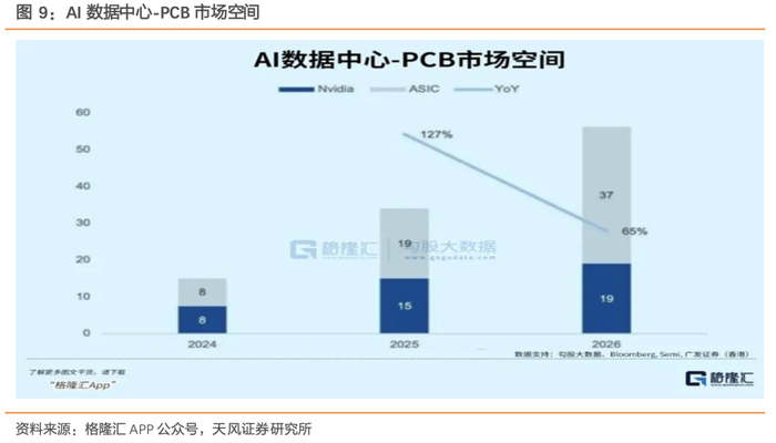 另一方面,ASIC带动高端PCB需求激增。因为AI ASIC目前的设计仍然沿用的是以往高速通信的主流方案,即用PCB承载高速带宽,使得单芯PCB价值量更高。另外,国内高多层+高阶HDI成为主要增量,国产算力也在字节等大厂带动下迎来爆发。