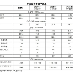据农业农村部市场预警专家委员会消息,2025年7月,2025/26年度中国大豆供需预测与上月持平。