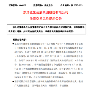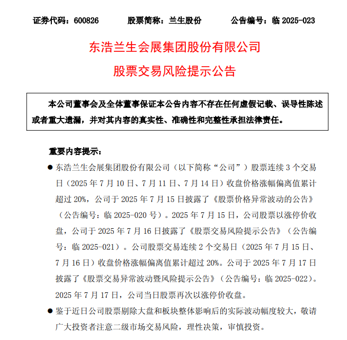 7月17日,兰生股份(600826.SH)发布股票交易风险提示公告称,公司股票连续3个交易日(2025年7月10日、7月11日、7月14日)收盘价格涨幅偏离值累计超过20%,公司于2025年7月15日披露了《股票价格异常波动的公告》(公告编号:临2025-020号)。2025年7月15日,公司股票以涨停价收盘,公司于2025年7月16日披露了《股票交易风险提示公告》(公告编号:临2025-021)。公司股票交易连续个交易日(2025年7月15日、7月16日)收盘价格涨幅偏离值累计超过20%。公司于2025年7月17日披露了《股票交易异常波动暨风险提示公告》(公告编号:临2025-022)。2025年7月17日,公司当日股票再次以涨停价收盘。