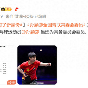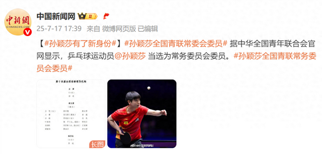 据中华全国青年联合会官网显示,乒乓球运动员孙颖莎当选为常务委员会委员。