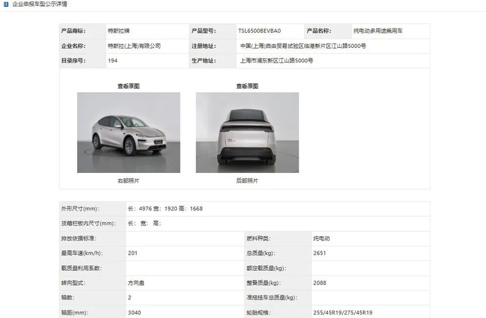 新车是一款长宽高为 4976mm*1920mm*1668mm,轴距达 3040mm 的纯电六座 SUV。定位介于 Model Y 和 Model X 之间,目前市场预测该车售价大概在 30-40 万左右。