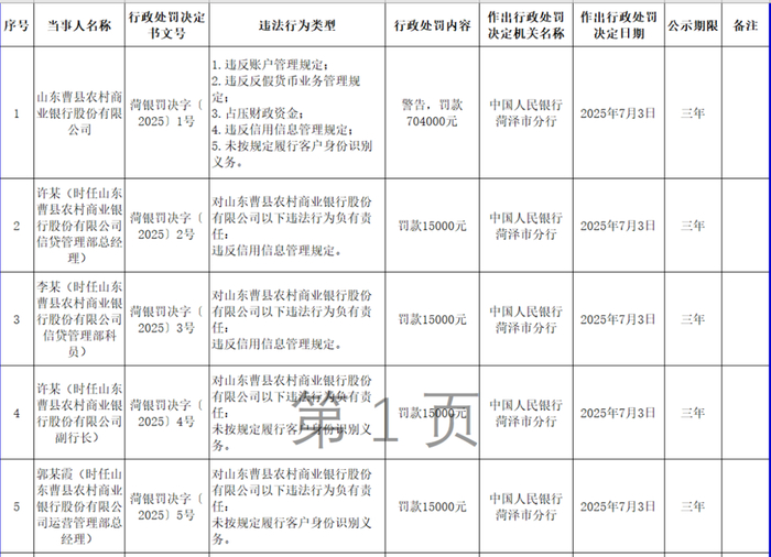 中国人民银行山东省分行官网显示,山东曹县农村商业银行股份有限公司(本文称“曹县农商行”)因存在五项违法违规事实,具体包括:违反账户管理规定;违反反假货币业务管理规定;占压财政资金;违反信用信息管理规定;未按规定履行客户身份识别义务。