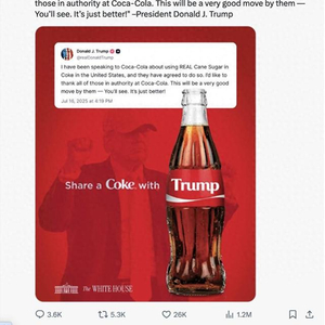 白宫社交媒体账号转发特朗普关于让在美销售可口可乐使用蔗糖帖文的截图。