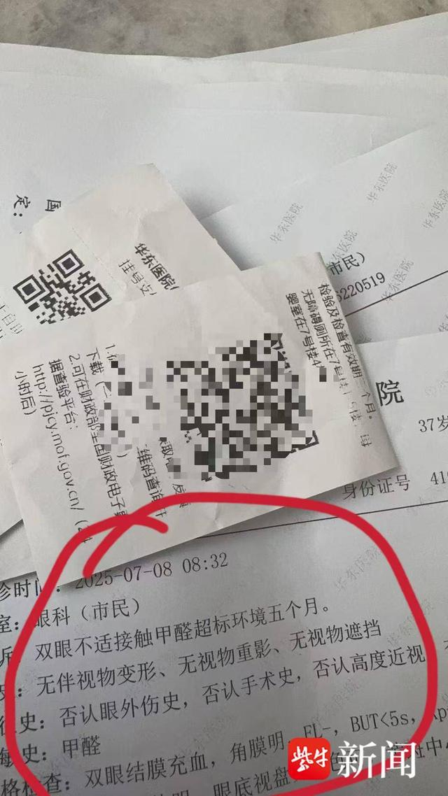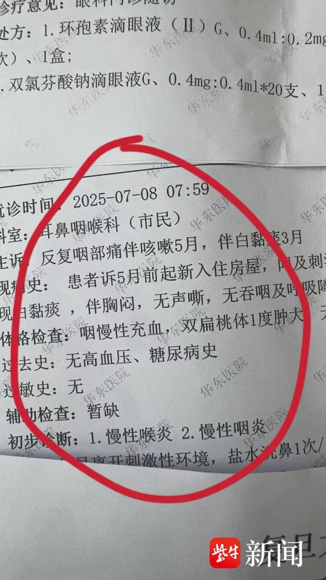 马先生告诉扬子晚报紫牛新闻记者,他于今年2月1日通过中介租下高档小区一户精装房。签约前,他被告知该房在2020年就完成了装修,此前对外出租多次,住过不少人。马先生是美妆自媒体博主,一天中大部分时间都在家里拍摄或直播。今年4月起,他开始持续出现胸闷、剧烈咳嗽、嗓子发炎甚至咳血等症状,多次前往医院就诊。马先生提供的诊断记录显示,他“双眼不适接触甲醛超标环境五个月”。