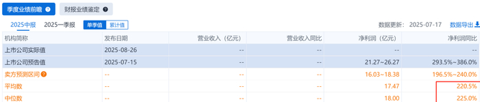 新易盛预计25年中报净利润37亿~42亿元,同比增长327.68%~385.47%,Q2单季净利润21.27亿~26.27亿元,同比增长196.5%~240.0%,根据朝阳永续业绩前瞻数据,这一业绩超分析师预期。