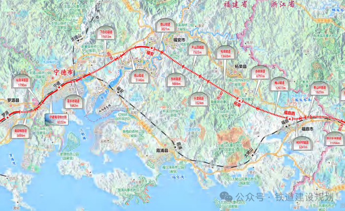 新建温州至福州高速铁路(福建段)正线全长203.822km,其中桥梁58座-47.058km,隧道33.5座-141.274km,桥隧占比92.4%。宁德联络线2.65km,连江联络线7.47km。