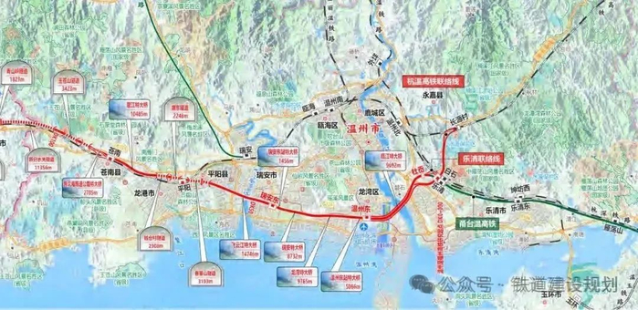 温州枢纽相关工程:(1)乐清联络线:新建联络线单线长7.274km。其中上行线3.491km,下行线3.782km。(2)苍南联络线:新建联络线单线长6.784km。其中上行线3.300km,下行线3.484km。(3)温州东存车场,近期新建存车线8条。(4)苍南存车场,近期新建存车线8条。(5)温州南动车所,新建存车线14条,不落轮镟轮线1条。