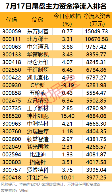 此外,还有中兴通讯、华策影视、昆仑万维、千红制药等尾盘主力资金净流入金额居前,均超6000万元。