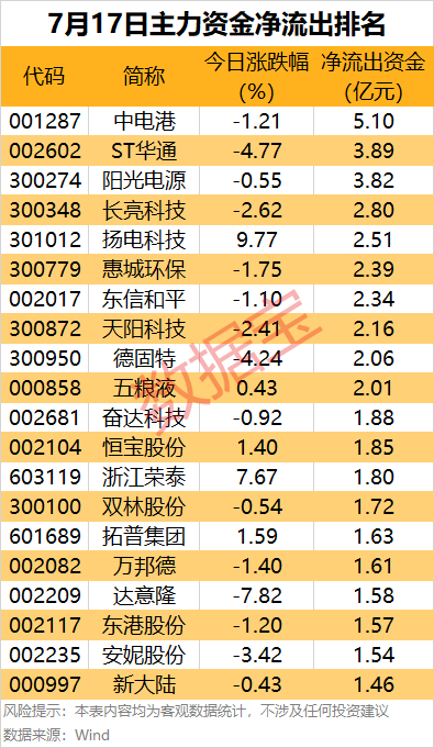 此外,还有ST华通、阳光电源、长亮科技、扬电科技、惠城环保等主力资金净流出金额居前。其中,扬电科技上涨9.77%。