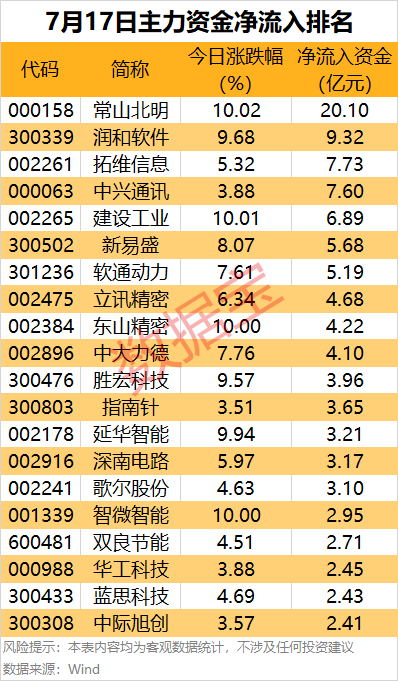 此外,还有拓维信息、中兴通讯、建设工业、新易盛等热门股主力资金净流入居前,均超5亿元。