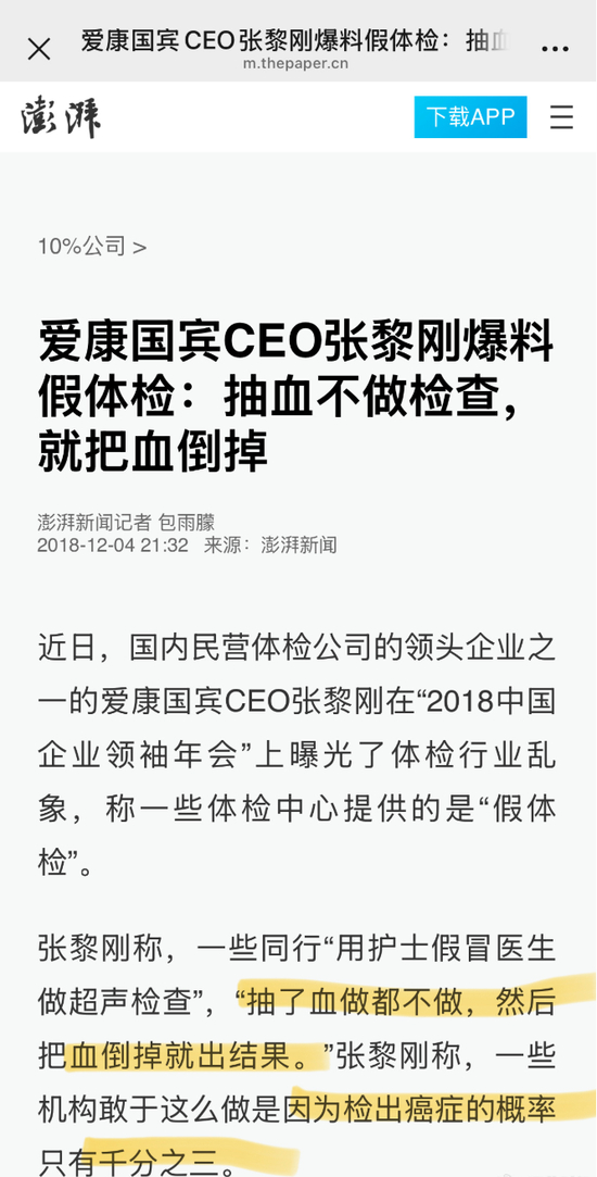 随后,“爱康国宾CEO曾揭行业造假黑幕”相关话题引发网友热议,据澎湃新闻报道,2018年,爱康国宾CEO张黎刚曾公开爆料同行假体检。张黎刚称,一些同行“用护士假冒医生做超声检查”,“抽了血做都不做,然后把血倒掉就出结果。”张黎刚称,一些机构敢于这么做是因为检出癌症的概率只有千分之三。