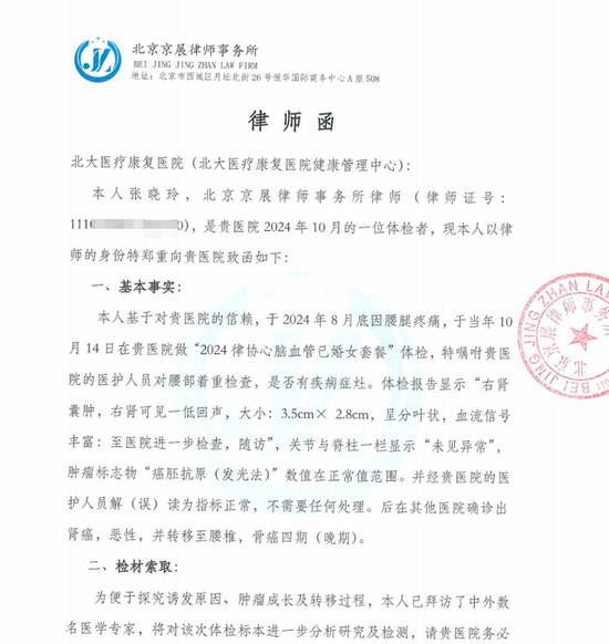 北京的执业律师张晓玲称她在爱康国宾设于北京的体检分院连续体检10年未被检出患癌风险,2024年被发现患癌时已是晚期,她质疑爱康国宾体检涉嫌 “ 误检、漏检 ”。