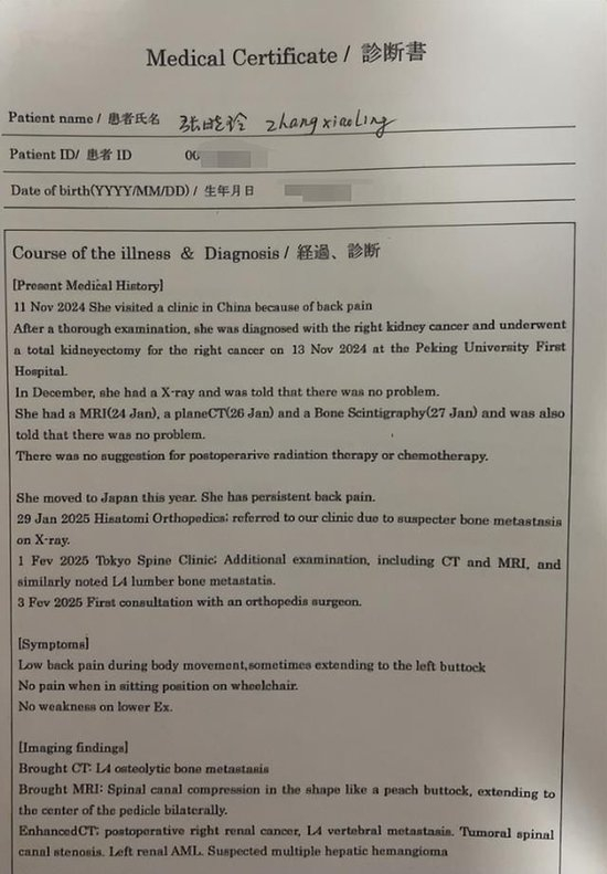 2025年2月,张晓玲又到国外的医院进行了检查,被确诊为“肾癌骨转移”。张晓玲称,她此后咨询过多位专家级的医生,都告知她,她所患的肾癌和骨转移都不是一朝一夕能形成的,如果能早发现早治疗,病情肯定不会如此严重。