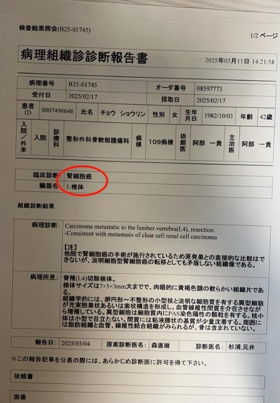 2025年2月,张晓玲在国外检查,被确诊为“肾癌骨转移