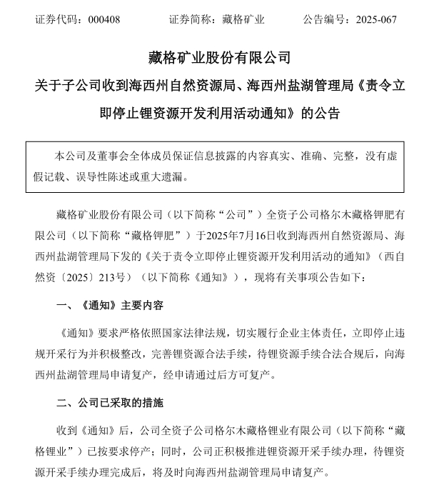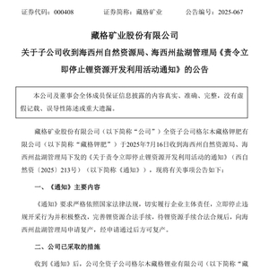 藏格矿业7月17日午间公告称,全资子公司藏格钾肥于7月16日收到海西州自然资源局、海西州盐湖管理局下发的《关于责令立即停止锂资源开发利用活动的通知》(以下简称《通知》)。