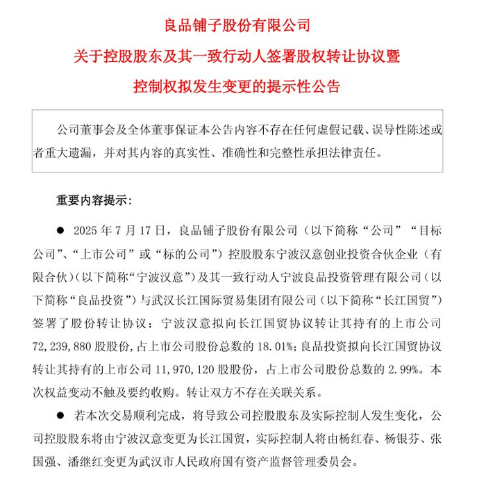 零食巨头良品铺子深夜公告:武汉市国资委将成公司实控人,股票明日复牌!股份转让款超10亿元