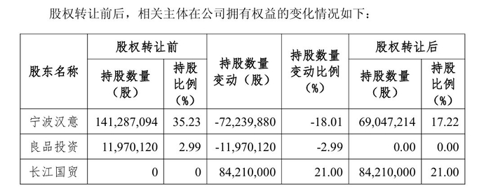 7月17日,零食巨头良品铺子(603719.SH,股价13.71元,市值54.98亿元)公告称,公司控股股东宁波汉意及其一致行动人良品投资与武汉长江国际贸易集团有限公司签署了股份转让协议。宁波汉意约定拟以12.42元/股的价格向长江国贸转让其持有的上市公司7223.99万股股份,占上市公司股份总数的18.01%;良品投资拟向长江国贸转让其持有的上市公司1197.01万股股份,占上市公司股份总数的2.99%。公告称,股份转让总价款约为10.46亿元。