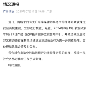 7月17日,广州市律师协会通报:近日,网络平台有关广东泰某律师事务所的律师邓某涉嫌违规收费的情况引发社会关注,我会高度重视,立即进行核查。经查,2024年8月19日我会收到韦某相关投诉材料,于2024年8月27日作出《纪律投诉案件立案告知书》,并依法依规启动调查程序。在调查过程中发现邓某律师还存在其他涉嫌违法违规执业行为需一并调查处理,目前该案处于听证阶段。案件的处理结果我会将及时公布。